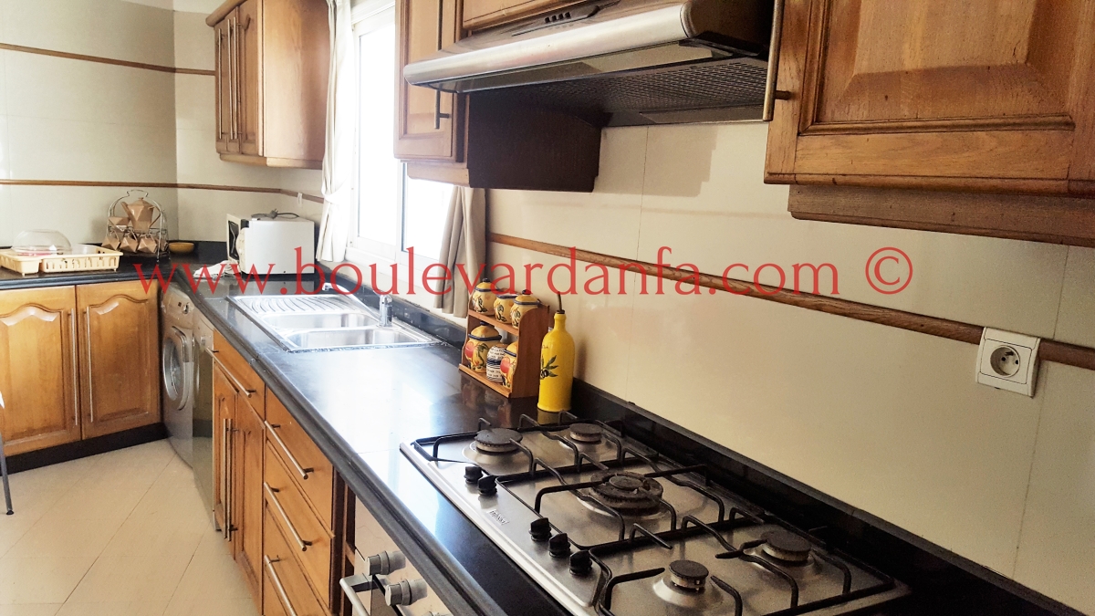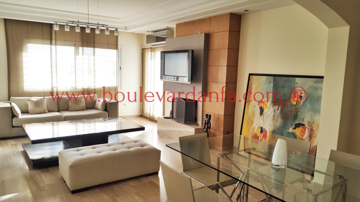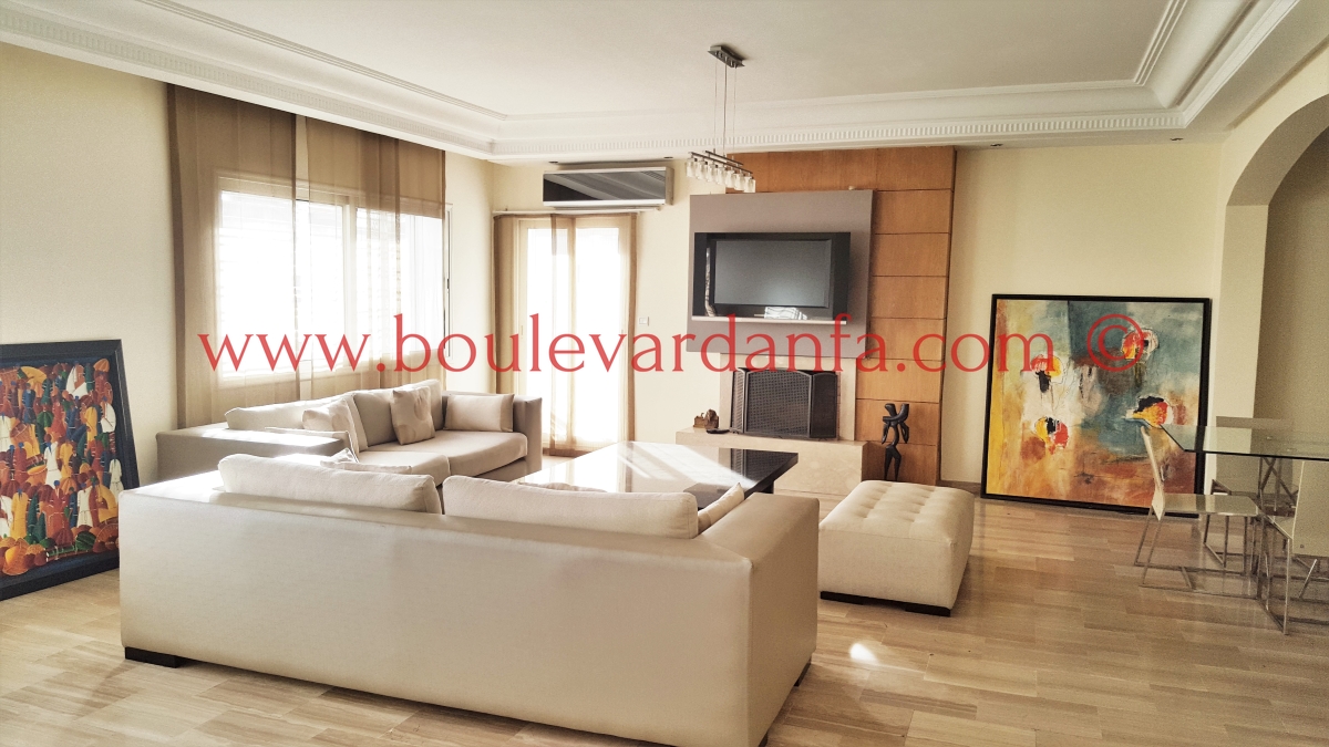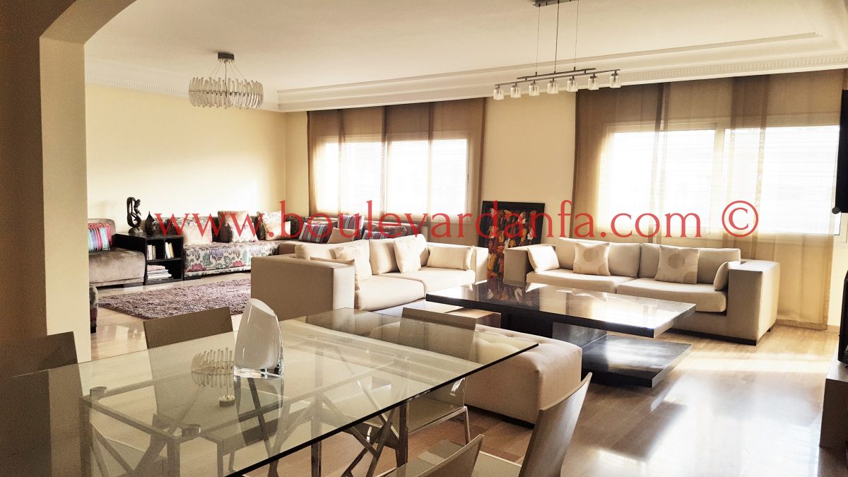 Superbe appartement meublé à Casablanca de 156 m² à Racine situé en plein coeur du quartier chic de Racine au 5ème étage d'une luxueuse résidence. Il comprend un triple salon avec cheminée et trois chambres lumineuses dont une suite parentale avec dressing et salle de bain.
