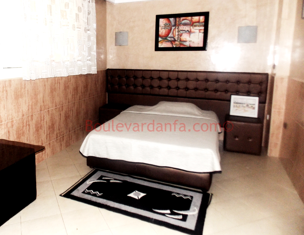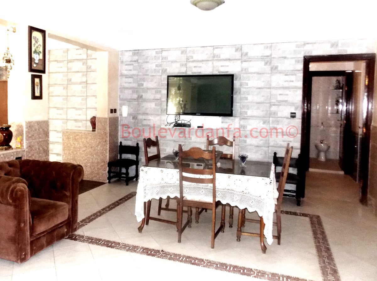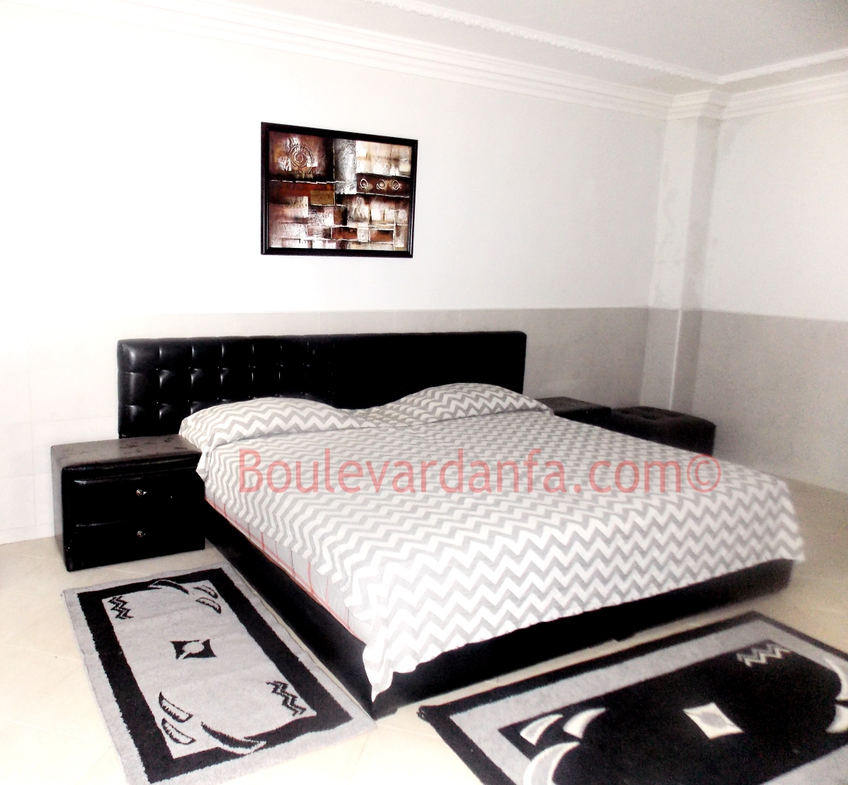 Dans un quartier calme, zone villa, proche de la zone offshore et de toute commodité et moyens de transport, se trouve ce joli appartement mené d’un jardin coquin et terrasse pour un bon chez soi. L’appartement à 150m² habitable se compose de 2 chambres à coucher avec lit single supplémentaire menés de placards, d’un grand salon marocain, salon américain et table à manger. La salle de bain est partagée en 3 pièces différentes et donc bien aménagée. La cuisine dispose d’une buanderie. Pour plus de paix, un espace jardin spacieux et verdoyant.