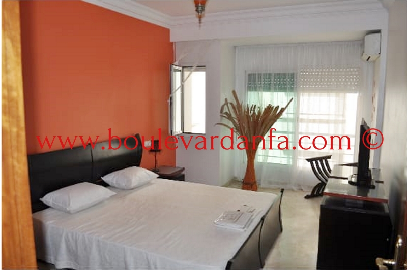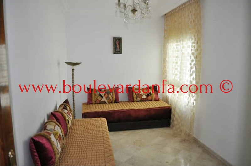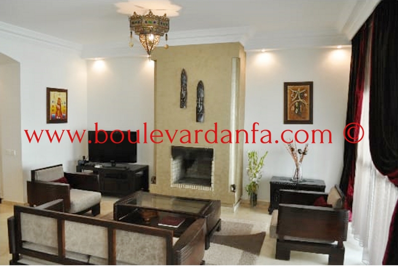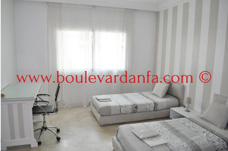 Magnifique appartement meublé de 172 m² à louer sur Racine, se composant de 2 salons dont un marocain et un deuxième européen avec cheminée, une salle à manger, une salle d'eau invités, une cuisine entièrement équipée, une véranda, 2 chambres dont une suite parentale et une pour enfants chacune avec sa propre salle de bain et une chambre de personnel avec WC et douche.