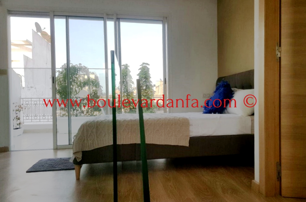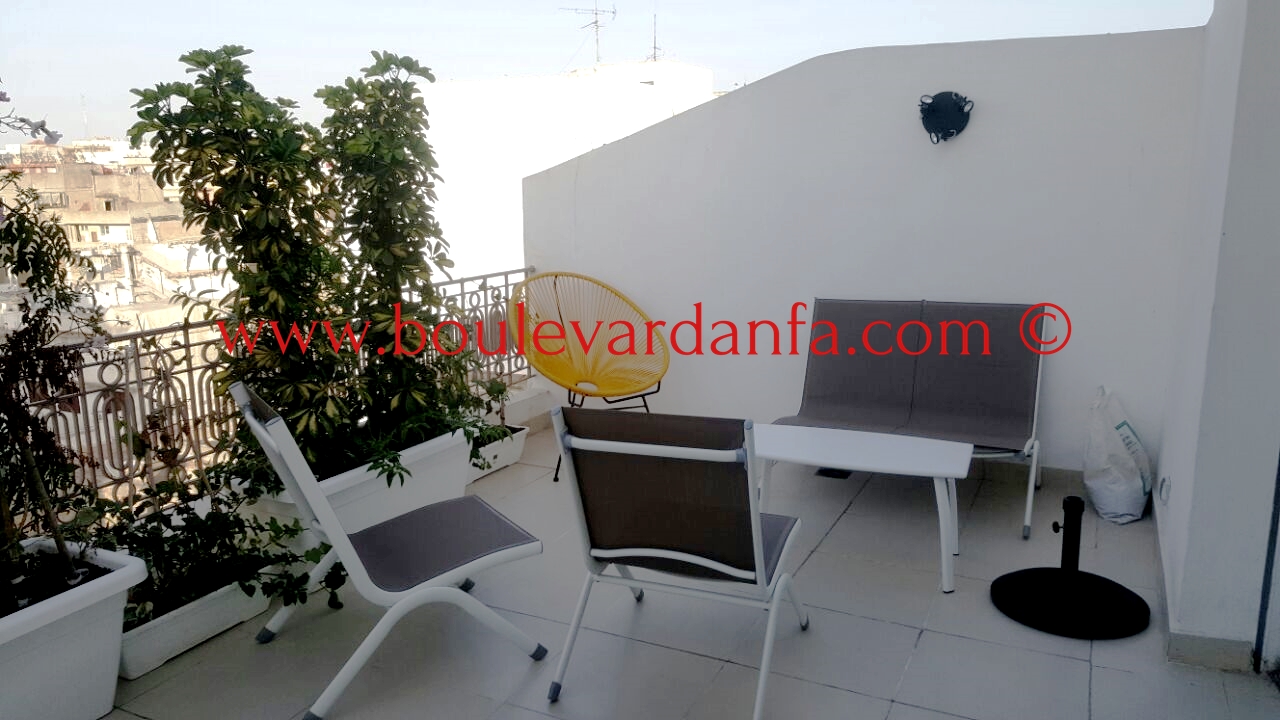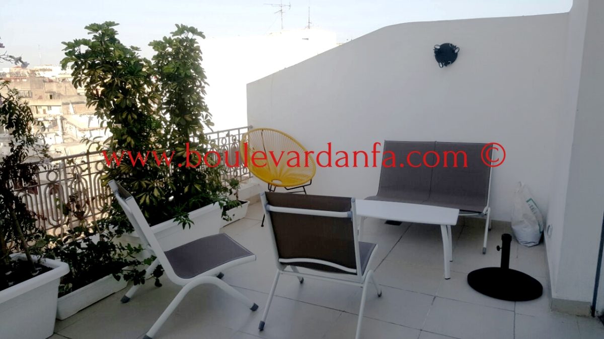 Studio duplex raffiné meublé à louer à Maarif se composant d'un salon avec coin bureau, cuisine totalement équipée, salle d'eau pour invités, et deux balcon donnant sur les deux façades. A l'étage, une chambre à coucher donnant sur une terrasse de 14 m² avec douche italienne.