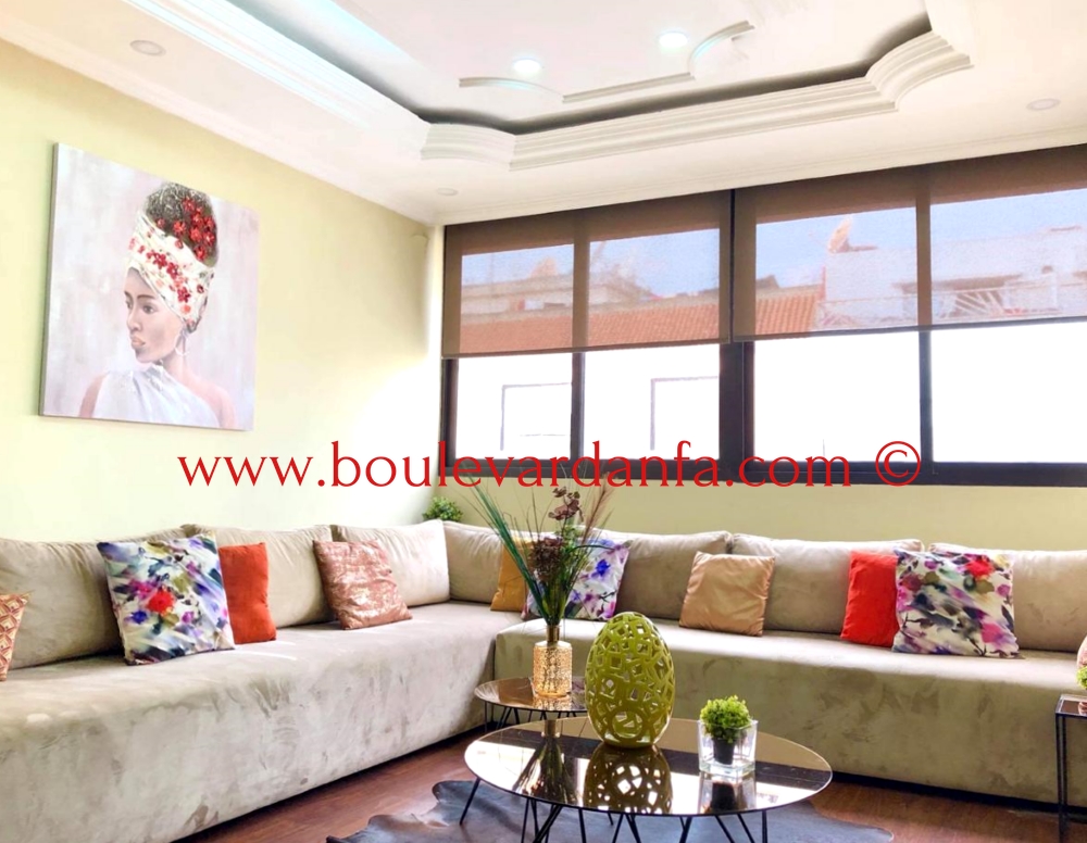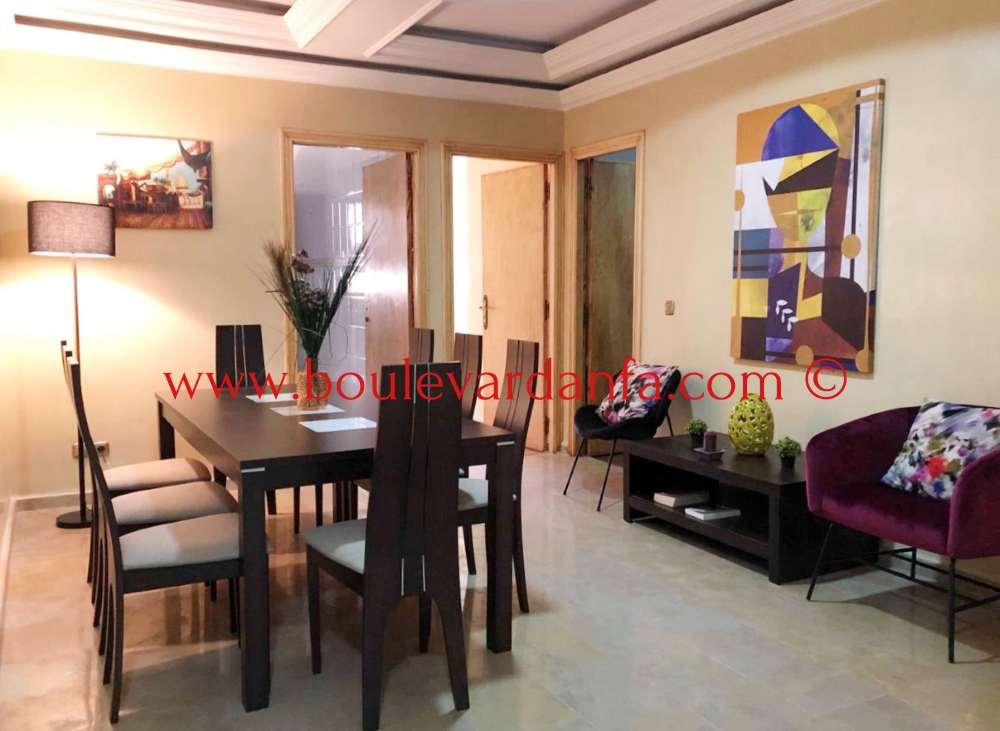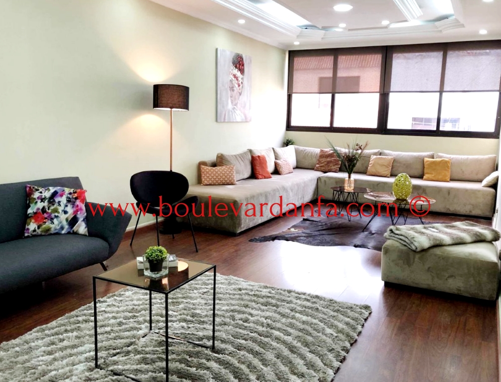 Très bel appartement meublé de 140 m² à maarif à louer, Il dispose d'un grand double salon Cosy et branché avec TV écran plat (câble et wifi inclus), 2 salles de bain indépendantes dont une avec baignoire, 2 grandes chambres avec deux lits doubles l'une d'entre elle avec balcon, un espace salle à manger très spacieux (8 personnes) et enfin une cuisine totalement équipée (vaisselle, lave-linge, sèche-linge, diverses machines, four, frigo, etc..).