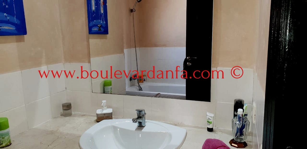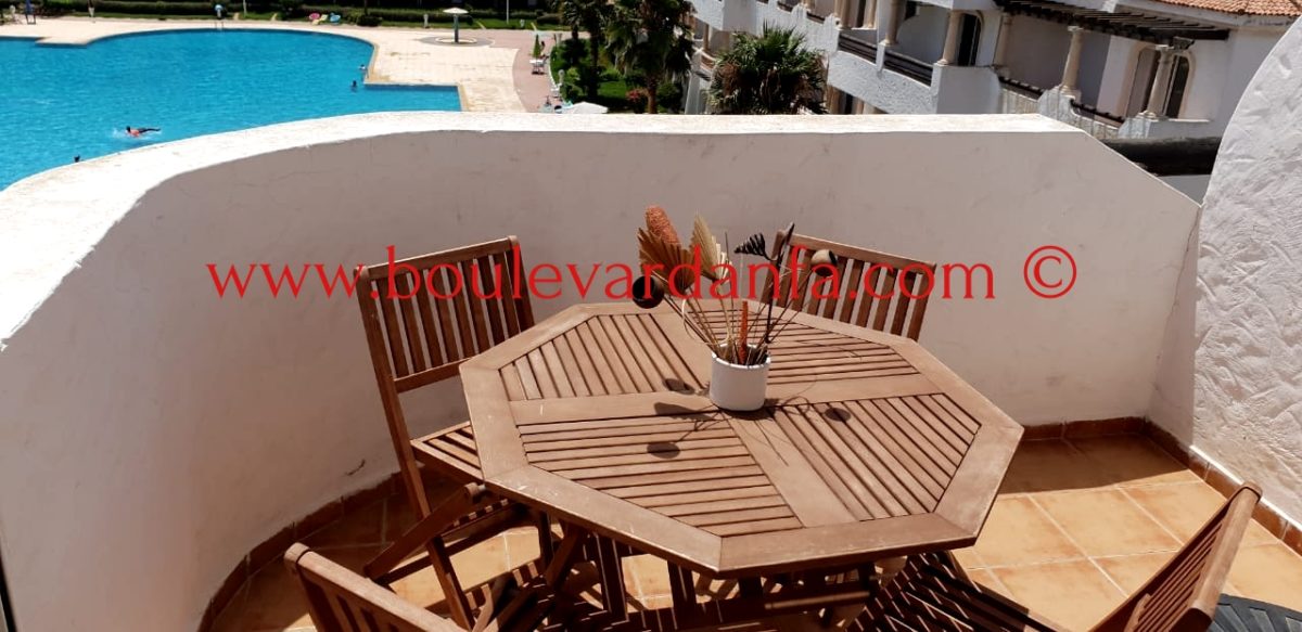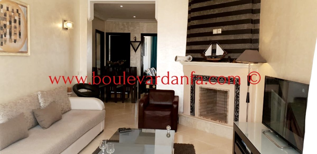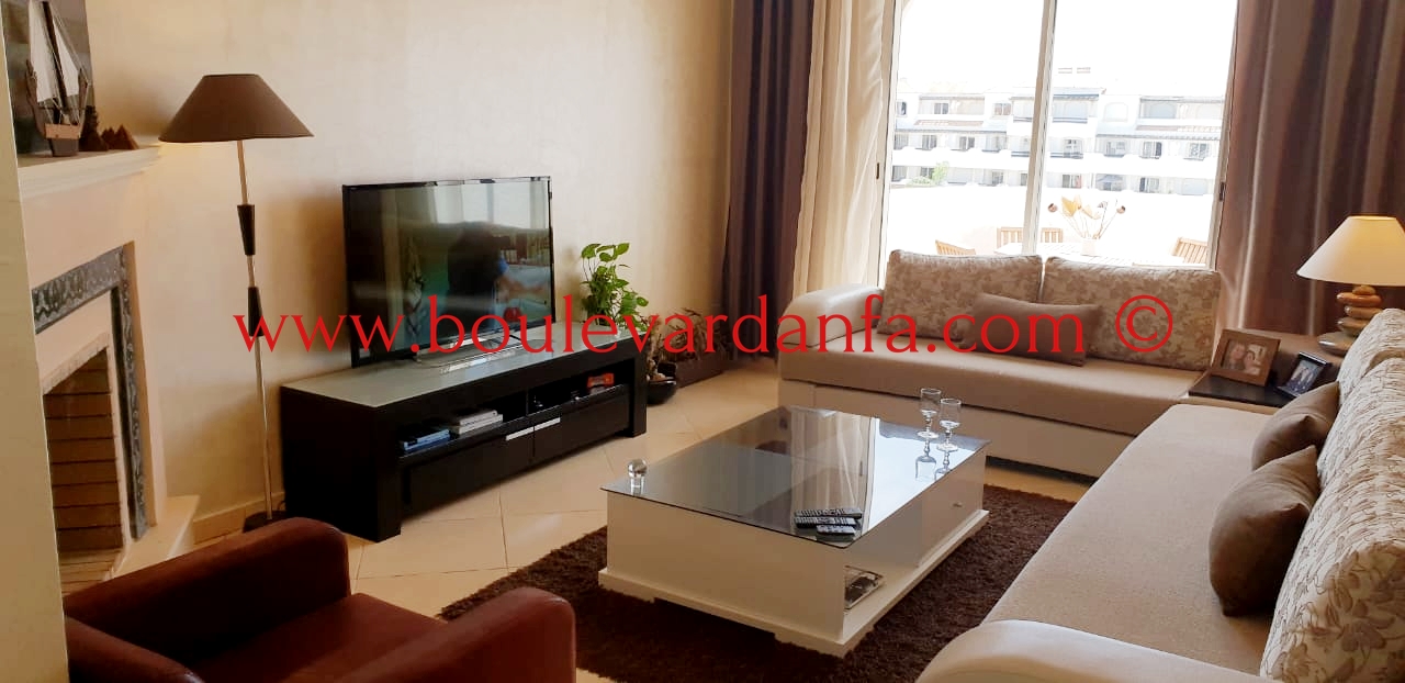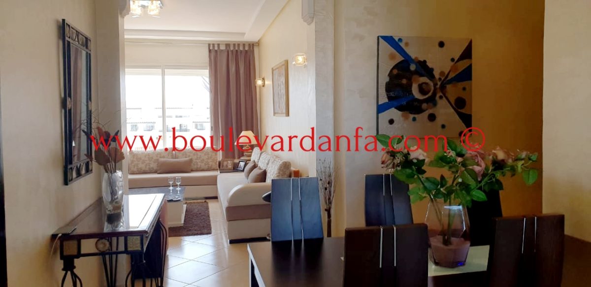 Très joli appartement de 100 m² meublé à louer à Sidi Rahal se composant d'une entrée, d'une salle à manger, d'un salon, de deux chambres à coucher, de deux salles de bain et d'une cuisine entièrement équipée.
